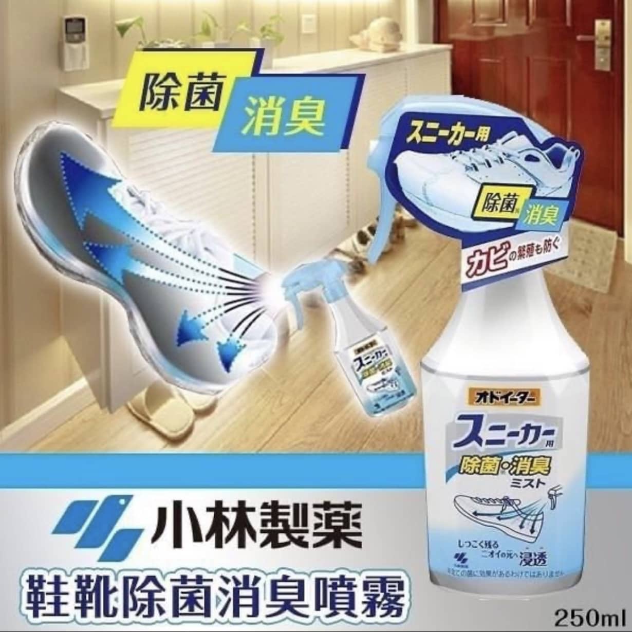 Previous Product Next Product 日本🇯🇵製 小林製藥鞋用除菌消臭噴霧~250ml $49.00 日本好物推介👍🏻 居家必備🏠 日本🇯🇵製 小林製藥鞋用除菌消臭噴霧~250ml 數量 加入購物車 描述 評價 (0) 描述 日本🇯🇵製 #小林製藥鞋用除菌消臭噴霧~250ml日本好物推介👍🏻 居家必備🏠 日本國內銷售熱買🔥小林製藥鞋子除臭殺菌噴霧👍🏻在穿完鞋回來後再噴上,抵禦難聞的味道,除菌效果,和消臭的效果,抵禦黴菌的繁殖,專為臭臭鞋的專用消臭噴霧👍🏻它能滲透到纖維深層,從而達到除菌和消臭效果,一瓶大概用800次左右🆗 ✔️消除鞋子難聞異味✔️可滲透纖維內層,強力消臭✔️除菌成分能消除細菌繁殖,防止形成異味✔️吸濕成分更能保持鞋子乾爽,防止黴菌滋生✔️除菌徹底,還能抑制細菌,居家必備✔️ 清爽強烈薄荷味,殺菌除臭 使用方法⭕️1.將噴頭上的黃色安全栓拉開2.在距離5~10cm的位置直接將本品均勻噴灑表面至鞋內 容量:250ml產地:日本🇯🇵製 商品評價 目前沒有評價。 只有註冊並且購買過商品的顧客才能撰寫評價。 相關商品 Quick View Quick View 日本🇯🇵Laundrin Tokyo香薰座 ~220ml $60.00 選擇規格 此產品有多種款式。 可在產品頁面選擇選項 Quick View Quick View 日本🇯🇵久光製藥鎮痛消炎貼40mg $42.00 加入購物車 Quick View Quick View 德國 🇩🇪Braun IRT6520 ThermoScan7專業式耳溫槍 $388.00 加入購物車 Quick View Quick View 日本🇯🇵【三笠製藥-強力消炎鎮痛藥貼100mg】 $68.00 加入購物車